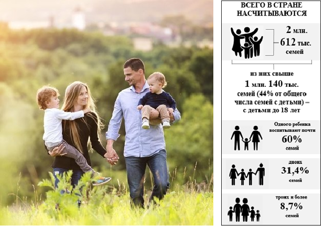 Всего в стране насчитывается 2 млн 612 тыс. семей, из них свыше 1 млн 140 тыс. семей (44% от общего числа семей с детьми) — с детьми до 18 лет. Одного ребенка воспитывают почти 60% семей, двоих — 31,4%, троих и более — 8,7%.