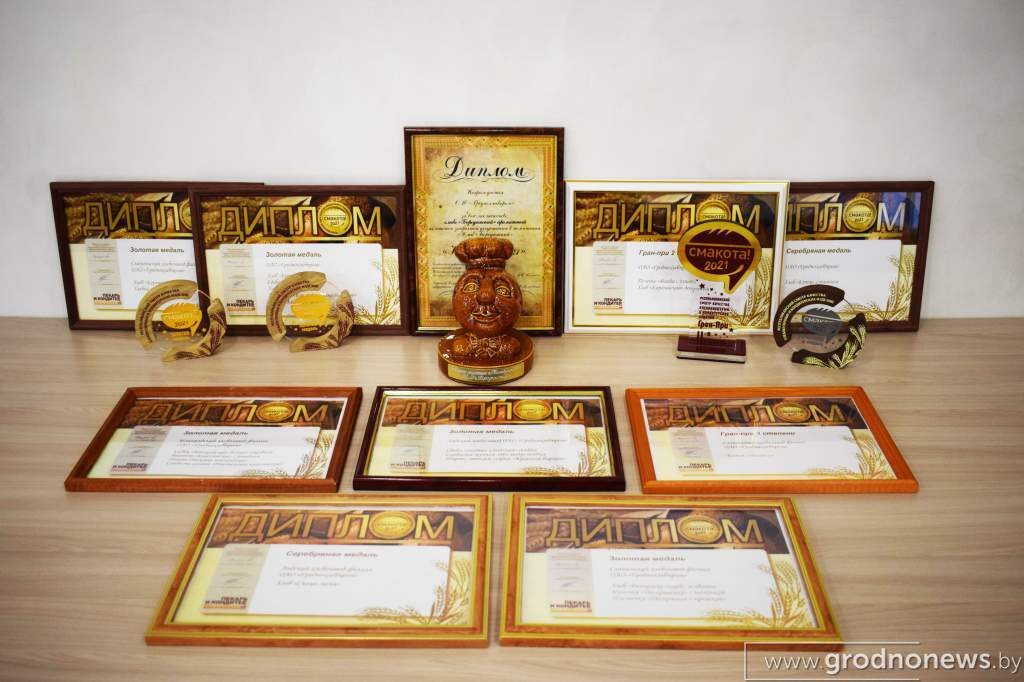 Высокое качество продукции ОАО «Гроднохлебпром» постоянно подтверждается на различных республиканских и международных конкурсах. Три Гран-при, 17 золотых и 2 серебряные медали, а также приз зрительских симпатий – итог участия ОАО «Гроднохлебпром» и его филиалов в республиканском смотре качества хлебобулочных и кондитерских изделий «Смакота-2021». На 27-й Международной специализированной оптовой выставке-ярмарке «Продэкспо-2021» портфель наград пополнился: хлеб «Купец» с тмином и торт «Этюд» медово-творожный – были отмечены золотом.