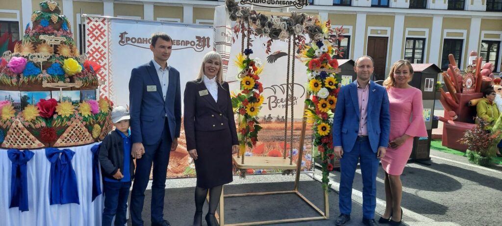 На каравае разместили достопримечательности Гродно,окруженные цветами.Для участия в арт-фестивале «Городские цветы» талантливые творческие работники нашей организации смастерили качели для фотозоны.