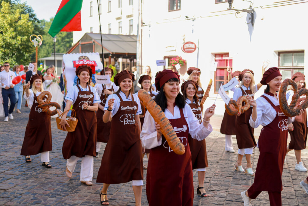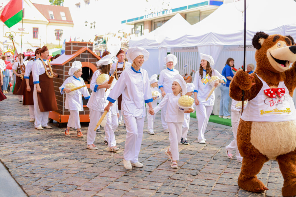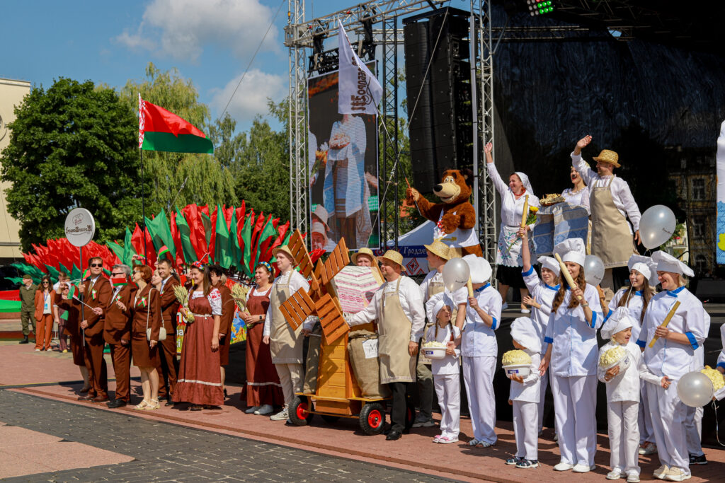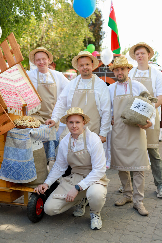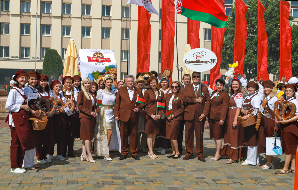 Наш коллектив отличился креативом и творчеством. Главной идеей было показать все этапы приготовления свежего и ароматного хлеба от зерна и до производства. В шествии можно было увидеть прекрасных жней с серпами, мельника с женой, замечательных пекарей, деток с румяными булочками и плетенками и конечно, главный символ — каравай, который с гордостью вручили Председателю Гродненского областного исполнительного комитета Каранику Владимиру Степановичу.