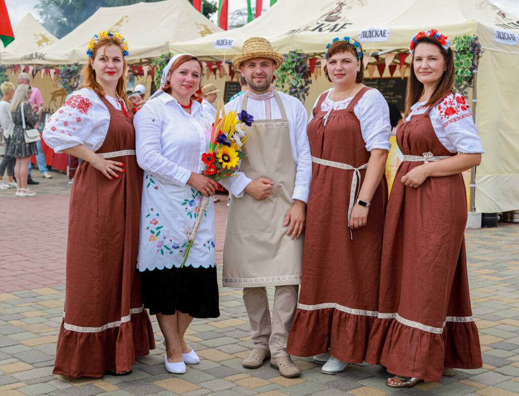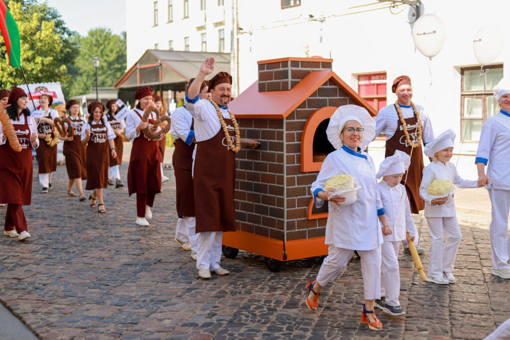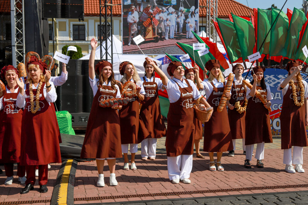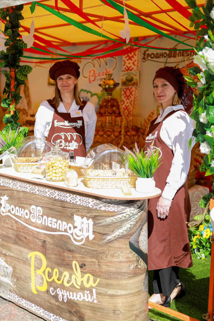 Наш коллектив отличился креативом и творчеством. Главной идеей было показать все этапы приготовления свежего и ароматного хлеба от зерна и до производства. В шествии можно было увидеть прекрасных жней с серпами, мельника с женой, замечательных пекарей, деток с румяными булочками и плетенками и конечно, главный символ — каравай, который с гордостью вручили Председателю Гродненского областного исполнительного комитета Каранику Владимиру Степановичу.